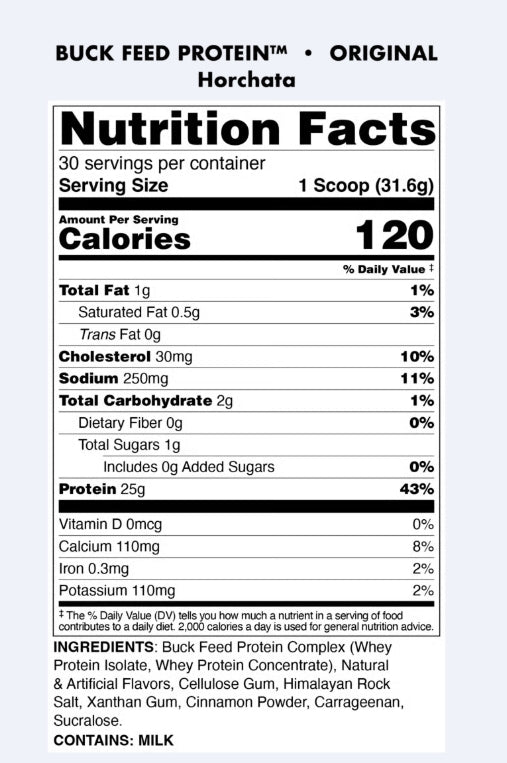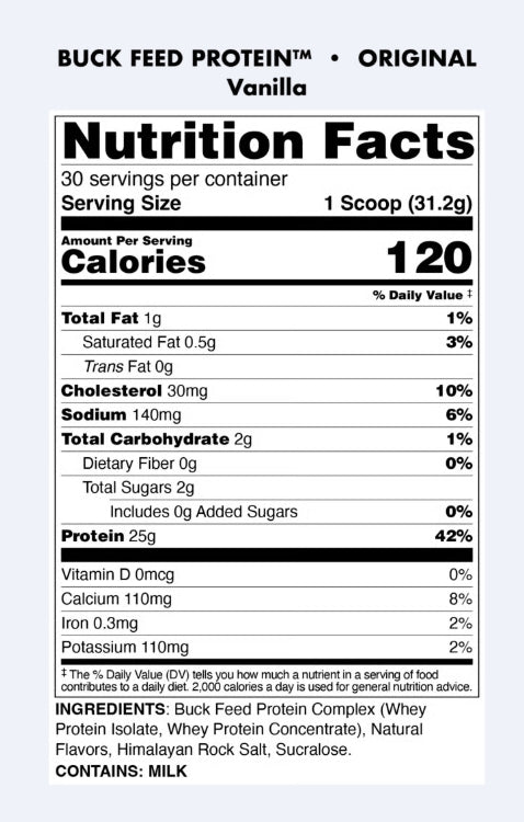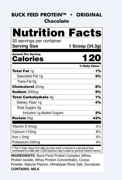 Our Original Buck Feed combines 25 premium grams of hormone-free Whey Protein powder to help you maximize your results and fuel your healthy lifestyle. Our Original Buck Feed does this by helping you build and maintain muscle and optimize fat-loss when combined with exercise*.