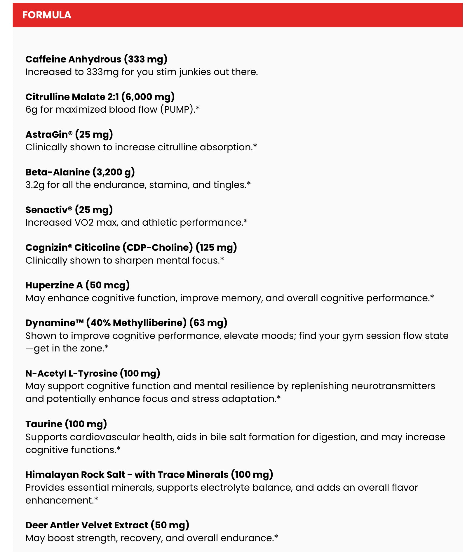 Not only is it formulated to help deliver everything you’ve come to expect from us -- energy, endurance, pump, and performance* --but it also features three brain-boosting ingredients to help promote mental sharpness, deliver hyperfocus, and improve mind-muscle connection.*