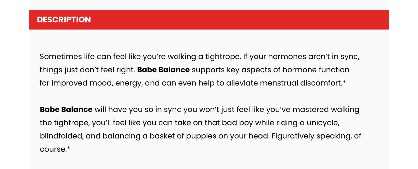 Introducing Babe Balance by Bucked Up. Specially designed for women, by women, Babe Balance includes beneficial, scientifically studied ingredients at the proper clinical doses. Take Balance for: healthy stress levels, estrogen regulation, thyroid function, and ideal hormonal health.*
